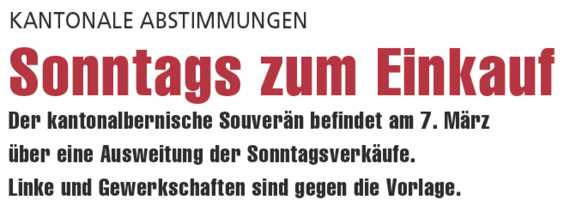 Der kantonalbernische Souverän befindet am 7. März über eine Ausweitung der Sonntagsverkäufe. Linke und Gewerkschaften sind gegen die Vorlage.